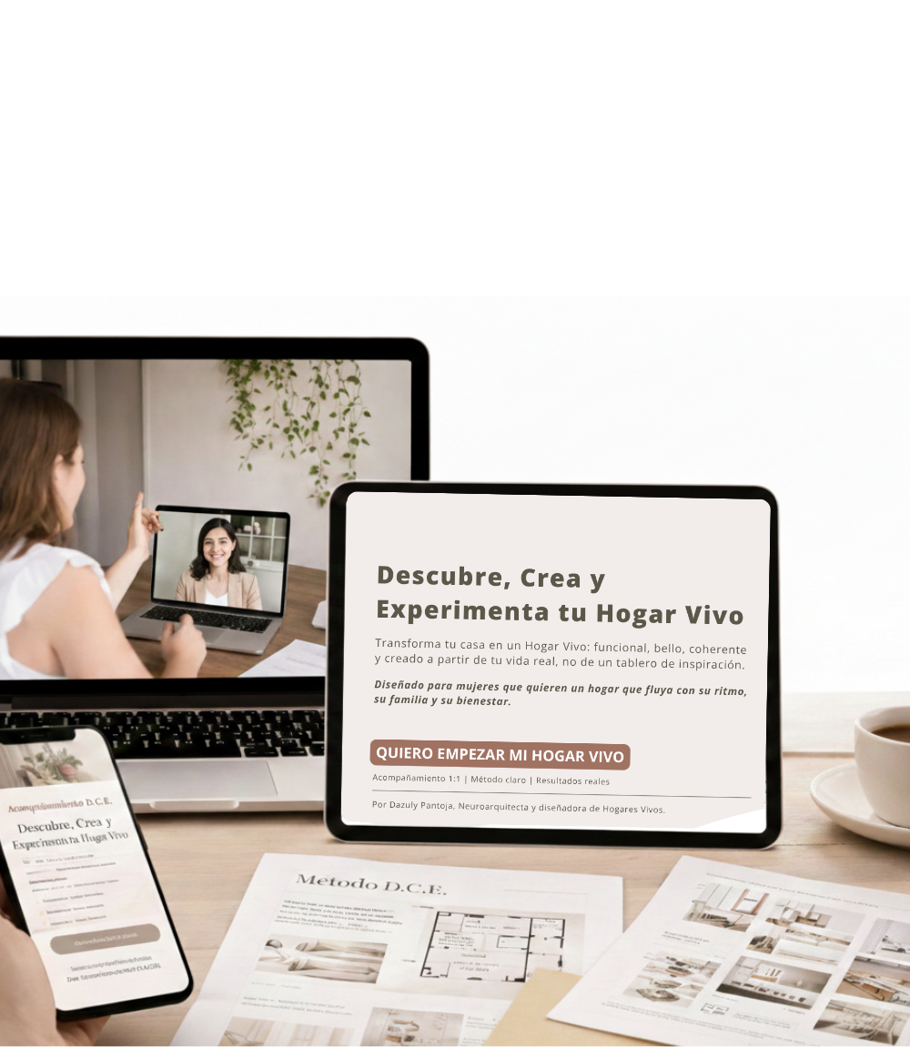 D.C.E. es un acompañamiento 1:1 totalmente personalizado donde transformas tu casa en un Hogar Vivo, a partir de tu vida real, tus rutinas y lo que hoy necesitas habitar.